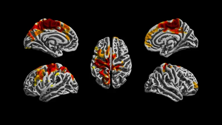 Brain scans show areas of reduced cortical thickness (coloured regions) in children exposed to higher levels of traffic pollution during their first year of life.Credit: T. Beckwith et al./PLoS ONE (CC-BY-4.0)